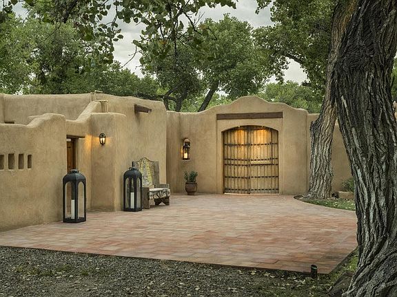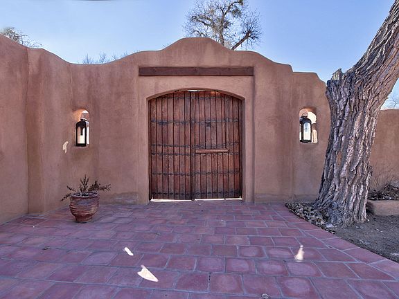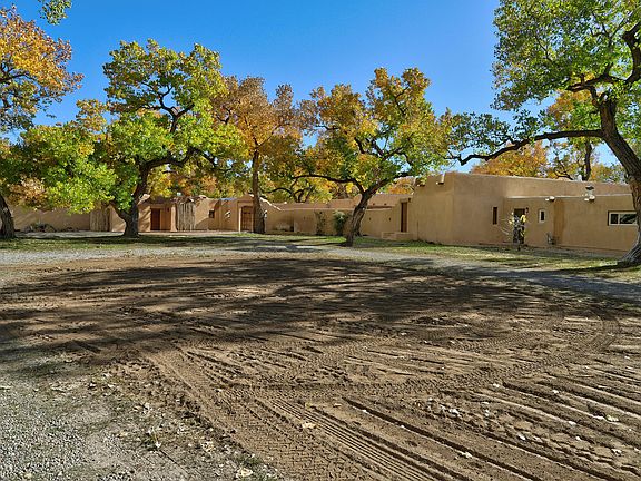 Offering the best of New Mexico! Enchanting Corrales Bosque estate with historic ''Canyon Road'' style adobe hacienda and three casitas on 5 private acres. The main hacienda and the casitas surround a romantic courtyard centered by a Moraccan fountain. An 18th century French Hacienda Carriage Gate creates an intriguing entrance to this compound. This property is a treasure with 6 garage spaces, three casitas, pool, pool bath, outdoor kitchen, Koi pond with gazebo, two stall barn, Solar system(owned) covers electricity while Starlink Wi-Fi covers most of 5 acres. Multi generational home or maybe a B&B or private oasis. The real magic is the Bosque. Immerse yourself in green summer shade, vibrant fall colors or ride your horse, walk miles of trails along the Rio Grande or Enjoy Sandhill