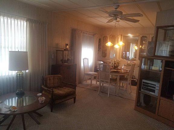 Surrounded by luscious green landscape, sits this beautiful 2 bedroom, 2 bath home. It features a refrigerator, stove, microwave, washer and dryer. This home has central air an electric water heater together with paneled ceilings and wood paneled walls. The floors are carpeted and also vinyl. It offers a roof over, vinyl siding, detached storage shed, a large sunroom and carport. One of the best features is that it has a lovely garden tub and light cabinetry in the kitchen and it comes furnished except personal negotiable items. The Lot rent is 754.00 Located in a wonderful park that is 55+ includes 5 clubhouses, 5 pools, game room, library, billiards and fishing. It is pet friendly. This dream home will not last long since it was also a welcome center for the park. So call today for a showing you will like what you see.
