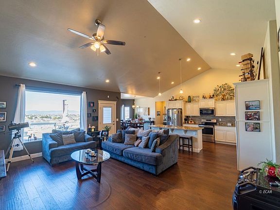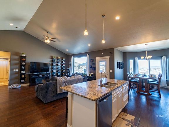 Welcome to 373 Fairway Lane where jaw dropping views meet magical entertaining. Built in 2019 on a 1.27 acre lot on the Spring Creek Golf Course and spanning over 2000 square feet this home offers four bedrooms, two and a half baths, a three car garage, a golf cart garage, full landscaping front and back, an outdoor fireplace & kitchen and an outdoor movie theatre! This home has it all and is turn key ready! If you have been dreaming of that special home with all the upgrades you've been wanting, look no further you found it! As you enter the home you will be greeted with an open concept living, dining and kitchen areas. Featuring a split floor plan you have two bedrooms and a full bath on one side of the home and the master bedroom tucked away behind the garage and a bonus room with a half bath upstairs. This home overlooks the valley and has spectacular sunsets that you can enjoy while you use your outdoor pizza oven & kitchen to prepare dinner! This home is truly a one of a kind home, you have to see it to believe it!