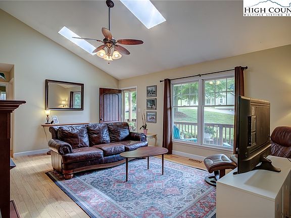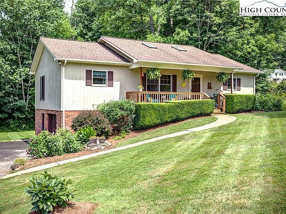 Location, Location, Location! Just a half-mile from Hardin Park School & New Market Center, 1 mile from Watauga High, and 2 miles from King St. and App State's campus, this 3 bedroom, 2.5 bath ranch-style home is mere moments from everything you need! Tucked into one of Boone's most desirable and convenient neighborhoods, & just steps outside town limits, this property sits on a 1.14 acre double lot with a large, mountain-flat yard offering plenty of space to garden or play. The lawn is bordered by woods and a charming creek that runs on both sides, and the property has been loving landscaped so that mature perennials are in bloom throughout the season. Once you're done admiring the Hydrangea growing alongside the paved driveway, you'll enter the home through the covered front porch and step into a bright and welcoming living room with hardwood floors, vaulted ceilings, two skylights, and a gas log fireplace. Straight ahead you'll find a spacious and functional kitchen with granite countertops, stainless steel appliances and an eat-in dining nook, plus French doors leading to the back deck for easy al fresco dining. To the right of the living room is the primary suite, which boasts a walk-in closet, full ensuite bath, ample room to accommodate a King-sized bed, and a wall of windows facing the lush foliage of the back yard. On the opposite side of the house you'll find two additional good-sized bedrooms and a second full bath w/ a tub. A finished basement offers nearly 500sq ft of flexible living space for an office, gym, or den. Note: ceiling is right at 7'. The basement/oversized garage combo has a laundry nook with washer & dryer plus room to hang and fold clothes, a workshop space, plenty of storage and a roughed-in half-bath (unpermitted). The home has central air w/ 3 zones, a sunny, south-facing aspect, and an outdoor propane line for the grill. Some furnishings are negotiable. No rentals allowed per restrictive covenants. Come see this gem before it's gone!