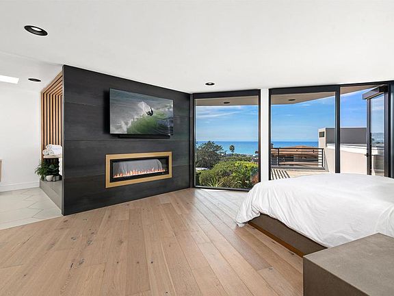 Discover this breathtaking modern masterpiece nestled in the secluded hills of Olde Del Mar—a true entertainer's paradise! Designed by the renowned architect Batter Kay, this four-bed, three-bath sanctuary offers high ceilings, an open layout, and a flood of natural light, all ready to showcase your artistic flair against its minimalist white walls. Step through the glass door and be captivated by the awe-inspiring interior. The primary suite boasts a private ocean-view deck and a spa-like bathtub overlooking the sea, perfect for ultimate relaxation. Two additional guest suites, one with a walk-in closet, share this level, along with a full bath. The lower level features a versatile fourth bedroom, currently serving as a home gym, complete with an ocean-view deck and a plunge pool—ideal for a refreshing post-workout dip. The gourmet kitchen opens to a brand-new BBQ deck equipped with a Traeger smoker, leading up to an expansive 800 sq ft rooftop deck. Here, you'll enjoy panoramic ocean vistas and sparkling Del Mar city lights. Perfectly situated within walking distance to "The Village," this home offers a blend of luxury and convenience that goes beyond what photos can capture. Experience this luxurious modern oasis firsthand—schedule your private showing today!