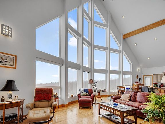 A wonderful blend of contemporary meets countryside on this hilltop! Upon entering this stunning home you are greeted with floor to ceiling windows perfectly framing the picturesque views of nature's beauty! The open flow allows for natural light to flood every crevice of all 3 levels of this home. There are 3 bedrooms, 3 1/2 baths, with the option of a primary suite on either the main or the upper level. You choose... but take note that the second level primary offers a private balcony, whirlpool soaker tub and falling asleep to the sunsets every night. The finished basement is complete with a new half bath, also has panoramic views and should satisfy any and all the entertaining you wish to do. The 24.5 acres are balanced well between partially wooded and cleared with a medley of flower gardens, a stocked pond and a 3 car heated garage. This is home you will want to experience!