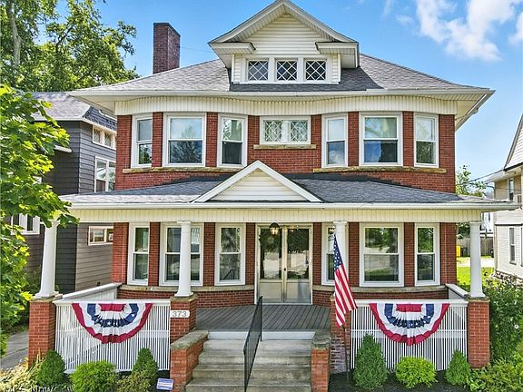 Lovingly cared for by the same family for over 7 decades, this stately brick home offers 2,694 sq ft of character and history in the heart of downtown Conneaut. From the expansive front porch and double entry doors, step into the entry hall where tall ceilings and a charming staircase welcome you home. The grand living room is anchored by a historic gas fireplace and bow windows. The character continues into the dining room with an antique swinging door that leads to the eat-in kitchen. The kitchen offers more dining space, ample cabinetry and connects to the backyard through a sunporch. A front parlor rounds out the main floor with flexible living space for an office or family room. As you journey up the main staircase, notice the second set of stairs - once used by household staff. The primary bedroom is a showstopper with its fireplace, curved wall of windows, dual closets and area for seating. There are 3 additional bedrooms, 1 with a balcony overlooking the backyard. An updated full bathroom with dual vanity and extra storage serves this level. The walk-up attic offers abundant storage and reveals traces of the home's early staff quarters. In the basement, just steps from the main floor kitchen, is the second bathroom. The lower level includes a gathering space, storage room, dark room, workshop and laundry room with utility sink. In addition to the front porch and sunroom, there is a back deck to enjoy the outdoors. There is a large 2-car detached garage and extra space for parking. The home is well maintained with updates in the past 10 years including vinyl windows, roof, composite front porch and bathroom. This historic home combines timeless architecture with the convenience of living in town. With restaurants, stores, parks and Lake Erie nearby, you are close to everything! Seize this remarkable opportunity to become the next steward of one of Conneaut's grand homes - schedule a private showing today!