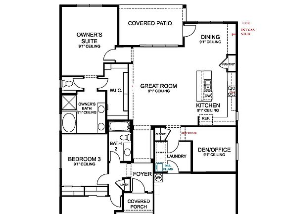 . Daybreak floor plan - a spacious and energy-efficient dream home. With 1832 square feet, this stunning residence offers 3 bedrooms, 2 baths, and a 2-car garage. The open-concept design seamlessly blends style and functionality, featuring a den for added versatility. Cozy up by the fireplace, complete with a blower for maximum warmth. Enjoy hosting family and friends in the dining area, expanded with a 4ft extension and a 6ft wide sliding glass door that floods the space with natural light. The master suite boasts an extended vanity for added luxury. Gas stubs and prewiring for solar and energy storage make this home ready for the future. Experience modern living at its finest with the Daybreak floor plan