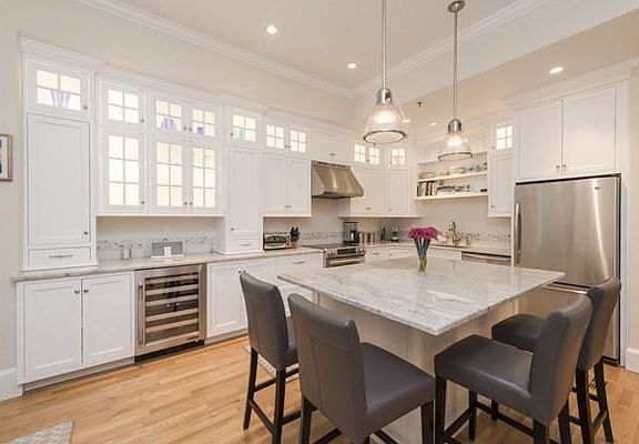 Sunny, mint-condition 3 BR parlor duplex w direct 2 parking! Parlor level three windows overlooking beautifully landscaped garden with mature trees, and hydrangeas, wood-burning fire place and classic floor to ceiling built-in bookcases. Gorgeous newly renovated kitchen includes custom white cabinets with glass display, river-gray granite counter tops, S/S appliances, incl wine cooler, island with seating for 5, bistro lights, and separate dining area with two windows. French doors open to third bedroom/office with large closet and extra overhead storage. Powder room with marble tile floor in basket-weave pattern. Master bedroom suite with large tub and floor to ceiling marble tile, and walk-in closet. Large front facing second bedroom, with three windows, and closet with built in shelves. Full bath w Carrara marble and glass shower. Bosch washer/dryer. Extra storage closet. Newer heating/A/C system, and windows. Pets Welcome!