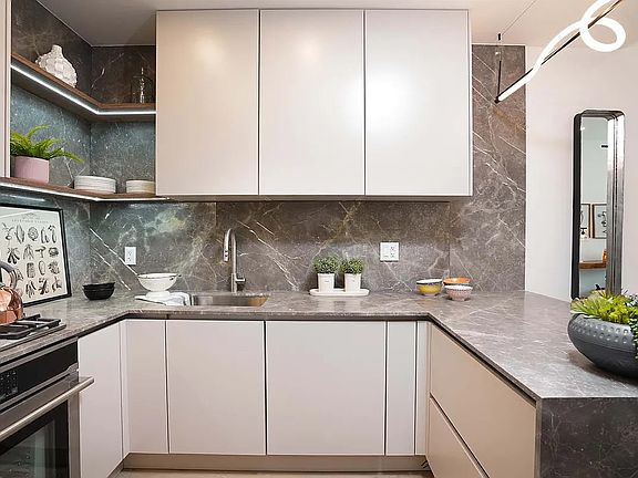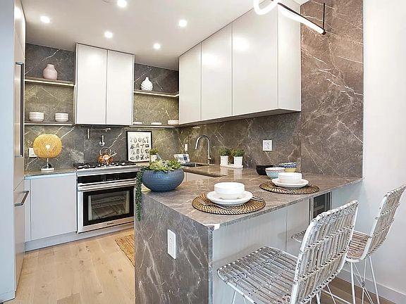 This is a luxury 1br apartment in a boutique condo building with a fully furnished rooftop terrace. The immediate area is bustling with a cornucopia of diverse restaurants and grocery stores. The L and M trains are half a block away, getting you to Union Square or the Lower East Side in 20 minutes. Ten minutes on the L and you're in the heart of Williamsburg. The kitchen has exterior ventilation, a custom-designed marble waterfall counter with a deep sink, and a built-in breakfast bar. The refrigerator, dishwasher, and oven are all high-end fully integrated appliances from Blomberg. There are floor to ceiling windows throughout the apartment. The in-unit washer and dryer are LG. The bedroom easily fits a King size bed set. The central air conditioning is whisper quiet. In addition to the abundant closet space, this apartment comes with a private storage room. Showing by appointment only.