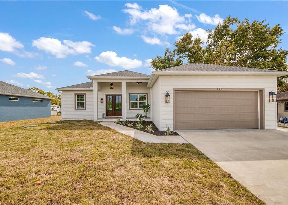 Nestled in the charming city of Venice, Florida, this brand-new, meticulously crafted residence by Blue Water Custom Homes awaits its owner. Reflecting the pinnacle of design and comfort, this 3 bedroom, 2 bathroom home spans 1,530 square feet, offering an open and split floor plan that maximizes both space and functionality. The house presents a captivating impression with its white hardi board lap siding, accented by a sand-colored garage door and matching trim around the windows, exuding coastal elegance. The front door, stained in rich dark walnut, stands as a statement piece against the soft exterior palette, while the tung and groove ceiling of the front porch adds a touch of classic sophistication. The front porch itself is generously sized, providing a welcoming entrance and an ideal spot for relaxation. Not to be overlooked, the oversized garage comfortably accommodates two cars, emphasizing the thoughtful design that caters to modern needs. Upon entering, one is greeted by luxury vinyl flooring that flows seamlessly throughout the living spaces, harmoniously blending with the porcelain tiled bathrooms. The interior boasts a soft cream trim, with door casing and interior door colors that add a layer of warmth and elegance to the home. The heart of this residence is its kitchen, which showcases sand shaker cabinetry adorned with crown molding and brass hardware, creating a harmonious blend of contemporary and classic design elements. The built-in range hood, flanked by four walnut-stained floating shelves, provides a striking contrast, while the white quartz countertops and waterfall island pairs with the zellige-inspired backsplash. Black pendant lighting over the dining area and island complements the black kitchen faucet and pot filler, adding a modern edge to the space. The master bedroom is a sanctuary of comfort, featuring a tray ceiling that adds an extra dimension of spaciousness. A stylish barn door opens to the en-suite master bathroom, its wooden vanity, black side sconces, black framed mirrors, and a shower adorned with chevron pattern tile and golden plumbing fixtures. The guest bathroom continues the home's theme of understated elegance with a shiplap wall, deep green vanity, and golden accents, including two gold side sconces, a golden mirror, and matching plumbing fixtures. The shower/tub combination is beautifully finished with zellige-inspired tiling, making it both a functional and aesthetic feature. This property, through its thoughtful design and attention to detail, promises a lifestyle of comfort, elegance, and convenience in Venice, Florida. This home is thoughtfully placed on the property for a future pool addition. When this home becomes yours, you are eligible to join the South Venice Civic Association where you'll have the opportunity to take the nearby ferry over to your private beach as well as having access to the boat launch to the intercoastal waterways. The Sarasota school district has been rated #1 in the state of Florida. Nearby Venice Gardens offers an Olympic-sized swimming pool with membership open to South Venice residents. The location also offers easy access to the Venice beach and fishing pier, an assortment of world beaches, Shamrock Park and the Venetian Way bike trail. There are plenty of great golf courses, shopping and dining options. There are NO mandatory HOA or CDD fees.