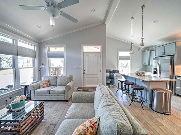 Would you like to spend your days watching the iconic boats come in and out of Grand Lagoon? Well, here's your rare opportunity to do just so! This 2020 beautiful build has tile flooring, granite countertops and stunning finishes. Great open floor with a nice size kitchen and living room. This may indeed be one of the best locations within the resort. The sweeping views of the Lagoon are incredible even from the comfort of the living room or enjoy them from the raised from porch... just truly breathtaking! Perfect for second home or investment opportunity! Venture Out is a golf cart community that has exploded with popularity recently. With 300' on the beautiful pristine beaches of the Gulf of Mexico and 1,000' on the Gulf!