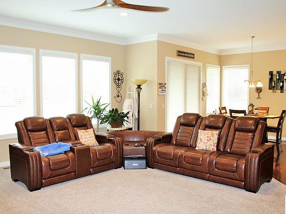 Custom built ranch home in the Dakota Dunes country club addition, located on a quiet cul de sac with golf course views! Main level features an open concept floor plan with 10ft ceilings, double crown molding, and beautiful hardwood floors. The kitchen boasts custom cherry cabinetry, large kitchen island, granite tops, SS appliances including gas range, and a walk in pantry. The oversized master suite includes a full bath with tile walk in shower, walk in closet, dual vanities, and convenient access to the laundry room. main level highlights also include a large living room with gas fireplace, dining area with sliders to the patio, additional bedroom, and a full bath. Prepare to be impressed by the newly finished lower level including a full wet bar, 2 bedrooms, office space, and a truly spectacular 3/4 bath with massive walk in tile shower. Enjoy entertaining your guests for summer bbq's in the private backyard with a 22x12 stamped concrete patio and a brand new electric sun awning. Recent updates also include new roof and carpet in 2017. This super clean property in a great location is move in ready so Don't Delay!
