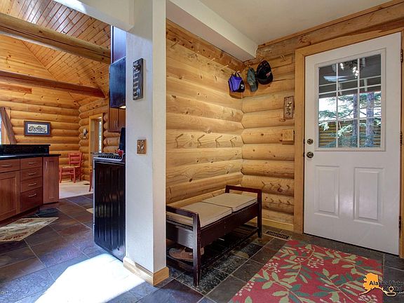 Custom log home with vaulted tongue and groove ceilings, natural cherry kitchen cabinets, granite countertops, and stainless appliances. Large master suite. Landscaped with covered side decks, arctic entry, and large back deck for entertaining w hot tub. Kitchen Remodel 2011, new metal roof 2008. Successful nightly rental for several years. Two storage buildings. Being sold turn key furnished.