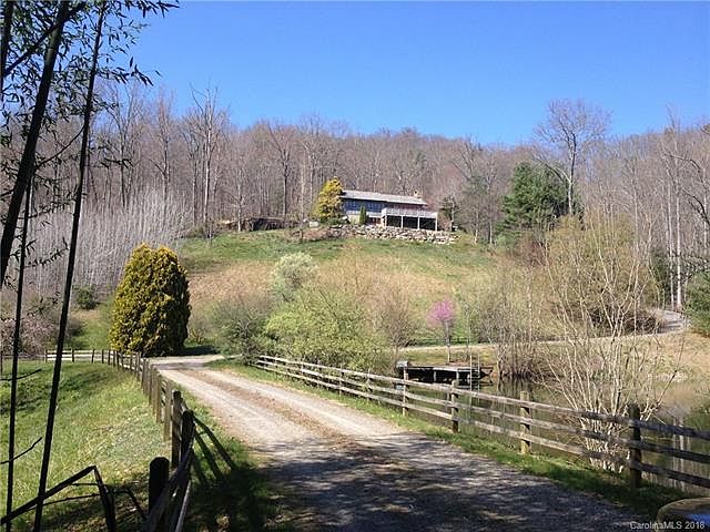 Private 54.15 acre estate nestled in the mountains! Enjoy the sunset and mountain views from the spacious deck or relax in the hot tub! The home features an open floor plan upstairs with 2 bedrooms and 2 bathrooms, office with closet, kitchen, living room and dining area with two wood burning fireplaces. The basement hosts 3rd bath, laundry, two bonus rooms and separate single and double garages. Tons of storage space! Beautiful stone work on patio, steps and outdoor fire pit. Three stocked ponds, small goat/chicken barn, and detached 2 car garage with workshop which could easily be converted to a stable. Both outbuildings have power, two wells on property. Beautiful rolling pasture is partially fenced with split rail fencing. Wide trails throughout for walking, riding or 4 wheeler access. ATV with cart included. Only 25 minutes to downtown Asheville and less than 10 mins to grocery!