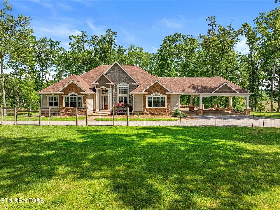 Welcome to your dream property, an expansive 162-acre paradise located just 5 minutes from the charming town of Jamestown, TN. This stunning estate features a 3536 sq ft home with 4 bedrooms and 3 baths, perfectly suited for equestrian, ranching or farming pursuits and outdoor enthusiasts. Nestled near the renowned Big South Fork National River and Recreation Area, this property promises breathtaking bluff and mountain views that will captivate your senses. Step inside the home to discover a range of bonus rooms offering flexibility for your lifestyle, whether you need extra bedrooms, an office, or a home gym. The spacious master bedroom includes a large master bath with a walk-in shower, providing a luxurious retreat. Work-at-home professionals will appreciate the fiber optic connection, with fiber run directly to the house and an additional Wi-Fi zone extending connectivity outdoors. The property features two large barns with water, ideal for accommodating horses and storing supplies. The main barn measures 40 x 43, while the separate hay barn offers convenient storage. Sustainable living is a breeze with a prepped garden area featuring raised beds measuring 60x40, perfect for growing your own fresh produce. Outdoor amenities include a covered 22x12 porch for relaxing and soaking in the stunning views, a creek, a fire pit, and abundant wildlife. For vehicle protection, there is a 24x23 double carport and a 12x23 breezeway. The home has seen numerous upgrades, including a large mailbox, registration in the Greenbelt agricultural tax program, a 50 amp RV hookup, a large mud sink, built-in shelving, window screens, upgraded HVAC thermostats, and improved internet service. The garden area has been prepped with fertilized soil, and two 13 ft x 4 ft Hugelkultur raised garden beds have been built. The property also features a fenced front yard for dogs, Empress Splendor trees, and plenty of woodchips for garden projects.