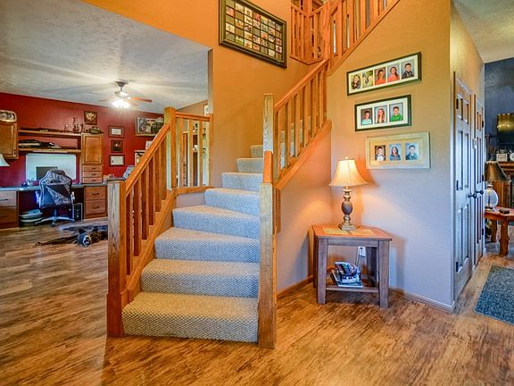 Contingent offer accepted. Open to backup offers only. Enjoy country living in this 5 BR, 4.5 bath, 2 story home sitting on 6+ secluded acres. Cook in the country kitchen with loads of cabinets,pantry & a dinette area. Luxury Vinyl Tile, a gas fireplace and cathedral ceiling gives you a warm feeling. The master BR on 1st floor has 2 walk in closets and a master bath with 2 sinks, shower and jetted tub. Walk along the hallway on 2nd floor & overlook the LR & entryway on your way to 2 BRs with a shared bath with 2 sinks! More living space upstairs includes a guest room, bath, a game/TV room and a 20x33 family room with a 2nd access stairway to the 3-car garage. Basement has plenty of light from double egress windows, several store rooms, 1 bedroom and a bath. The wood burning stove provides additional heat along with 2 heat pumps. Extra vehicles, mowers etc fit in the 40x60' shed. The 50x50 barn has 2 wooden horse stalls and ample room for other critters. Enjoy the bridge over the pond from the back porch/deck. Call for a Private showing.