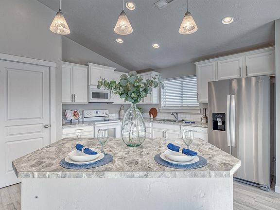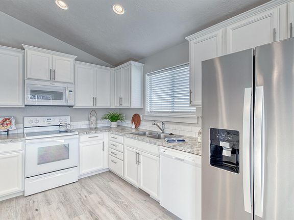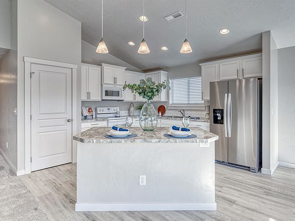 Immaculate Single level home near Settlers Park in Meridian. This darling split bedroom floor plan offers an open great room with vaulted ceilings and a white kitchen with upgraded cabinets, a bright window in front of the kitchen sink, a kitchen island with bar and overhead pendants, and a large pantry. Stainless Steel refrigerator included. Natural light with plenty of windows showcasing the new LVP Flooring and new carpet throughout with new interior paint. The primary suite offers a barn style door to the bathroom, dual vanity, a large shower and large walk-in closet. Blinds in bedrooms and in kitchen are included. Fully-fenced yard with landscaping, full sprinklers, irrigation and RV/trailer parking. No back door neighbors. Home backs to irrigation canal which provides nice privacy. This home is tucked back in the interior of the subdivision, so no busy drive by traffic. Better than NEW & GREAT location!