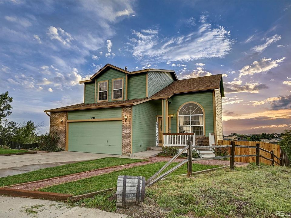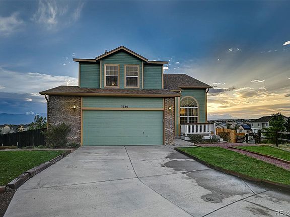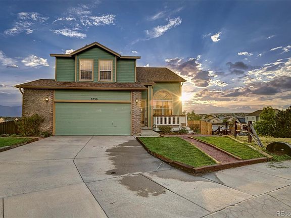 This Fabulous 2 story home has Amazing Views of Pikes Peak!! It is located in the subdivision, Pronghorn Meadows which is near Peterson AFB, near schools and near shopping centers! This home sits in a quiet cul-de-sac, has a large 2 car attached garage, a front porch with a covered entryway and a nice landscaped yard! When you step inside this house, you will notice the brand new carpet throughout! The formal living room has high vaulted ceilings. The kitchen has beautiful tile countertops, a nice island and wood cabinets! The dining area features a huge bay window that allow lots of natural light into the home and also allows you to see the most amazing mountain views while sitting at your dining room table! The dining room is open to the family room. The family room features a cozy fireplace and a walk out to the brand new deck! The master suite has a sitting room adjoined as well as a 5 piece master bathroom and a walk-in closet! There are also two other bedrooms on the upper level of this home and a full size bathroom! This home features an unfinished basement which is great for storage or lots of room to grow in the future! This home has so many amazing features and absolutely stunning views of Pikes Peak! It is not going to last long, so come see it today!!!