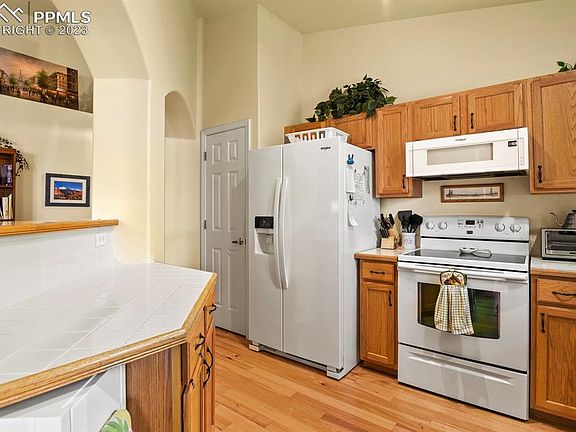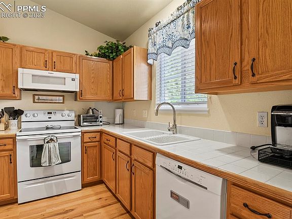 Beautiful move in ready 2 bedroom 2 bath condo in desirable Strawberry Field gated community. Available fully furnished if buyer desires. 1 car detached garage plus an assigned covered parking space. Open floor plan with tall vaulted ceilings and lots of windows for great natural lighting. Spacious kitchen with pantry and plenty of cabinet and countertop space. The kitchen is connected to the dining and living room with a gas fireplace. Walk out to the covered patio from the dining and primary bedroom to enjoy views of Cheyenne Mountain. Spacious primary bedroom with walk in closet and attached private bath. There's also a 2nd bedroom, full bath, and laundry (washer and dryer included). No carpets, all hard flooring makes for easy living! Great location near Fort Carson with nearby parks, hiking trails, schools, restaurants and shopping. This is a well kept gated HOA community with a tennis court, exercise room, club house, and pool. Come see today!