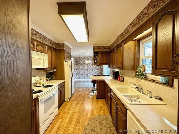 Adorable well maintained 3/2/2 plus large den with fireplace and wall of windows overlooking gorgeous backyard with rock patio. Light and bright formal living and eat-in kitchen with breakfast bar and lots of cabinets. Two additional nice size bedrooms and hall bath with whirlpool tub. Primary bedroom with nice master bath. Huge backyard with storage building and fully fenced. Updated roof and gutters in 2021. Conveniently located and only 15 minutes from Downtown Tulsa or Tulsa Hills. Berryhill Schools.