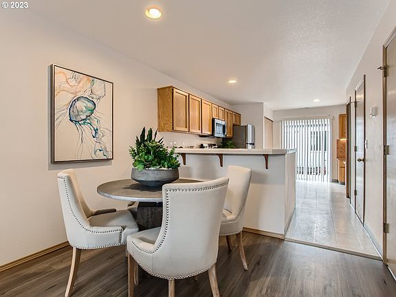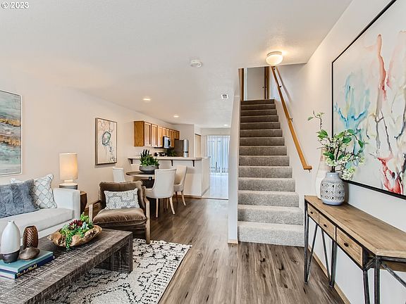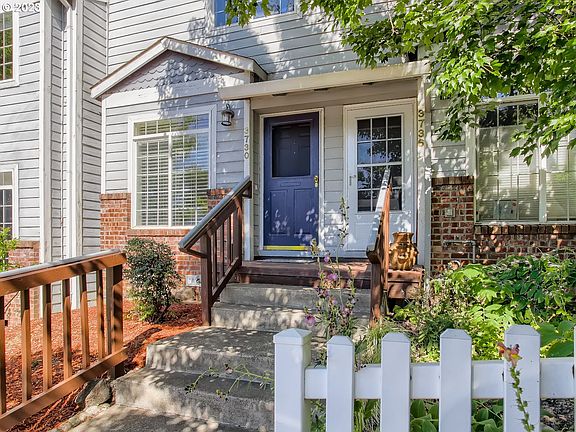 Wonderful townhome at a fantastic price! Move-in ready, energy efficient, and in convenient location. No HOA or monthly dues. New flooring and kitchen appliances. Freshly painted. Treks decking and furnace new in 2020. Open-concept living room, dining area and kitchen. Builtin desk study area at back with sliding doors to private backyard. Both bedrooms upstairs have their own bathroom. Detached garage has builtin counter and cabinets for work space. Good rental opportunity. [Home Energy Score = 9. HES Report at https://rpt.greenbuildingregistry.com/hes/OR10204193]