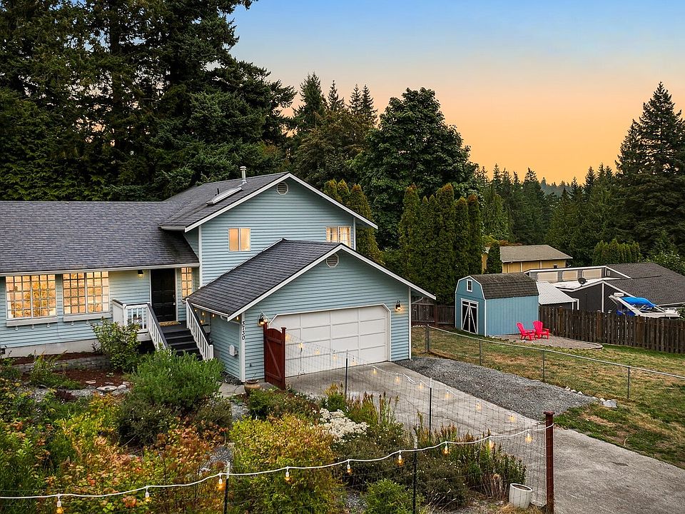 Welcome to this beautifully laid out home in the sought after Tweed Twenty neighborhood. The updated open kitchen features quartz countertops and vaulted ceilings, flowing into a bright dining and living area filled with natural light. Upstairs, the spacious primary suite includes a full bath, with two additional generous bedrooms nearby. The lower level offers a versatile family room or home office with slider access to the fully fenced yard. Recent updates include a brand new hot water tank for added peace of mind. Enjoy a sunny patio, deck off the kitchen, large shed, and gorgeous low maintenance native garden. With plenty of parking plus trails and parks close by, this home has it all.