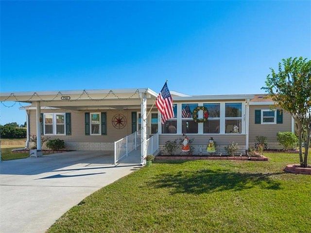 GATED GRAND HORIZONS where you OWN your land! Must See huge 2,400 sf home to appreciate! Located on low traffic Cul-de-sac, Jacobson 2005 Classic Model has all the bells & whistles! Park side by side on double carport with concrete ramp to your Enclosed Florida room! Once inside, ceramic tile foyer & vast OPEN great room with Vaulted ceilings greets you. New interior paint, ceiling fans, lighting, carpeting & transom windows give it light, bright feel! Tile floor in Dining Room, OPEN kitchen boasts generous Oak wood cabinets with pullout drawers, breakfast high-bar, Whirlpool appliances include wall oven, drop in smooth cook top, raised dishwasher, built in microwave, new disposal 2015, double ceramic sink with soap dispenser. ALL NEW double-pane windows with lifetime guarantee offer low utility bills! Master suite has 11 x 13 owners retreat for sitting area, den or office. 3 bedrooms, 2 baths PLUS BONUS room off guest suite for Craft/Hobby room or office with built in cabinets & more windows. Inside utility room with cabinets above Maytag Neptune washer/ dryer with rear exit door to side yard & attached shed. Backyard has views of retention pond with water views in the rainy season! NEW AC in 2015, FURNISHINGS are negotiable! Located within one mile of shopping, theater, YMCA, bowling, doctors and hospitals in an active 55+ community with resident owned clubhouse, heated pool & spa, shuffleboard, billiards, private roads, planned activities, entertainment & excursions. CALL TODAY to see this GRAND home!