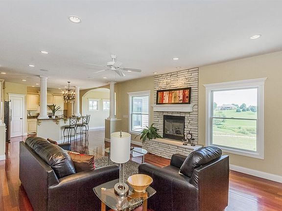 All custom all brick front 2 Story nestled on over an acre & adjacent to 22 acres of common ground w/ a beautiful pond view in Lacina Meadows! Gracious 2 story entry; gorgeous Brazilian cherry flooring; 1st flr study w/ B-I bookcases; elegant formal dining; granite countertops w/ raised bar, upgraded cabinetry, all appls, W-I pantry, & breakfast room; 1st flr laundry w/ utility sink & counter space; stone FP & raised hearth; Andersen windows; crown mouldings, stamped concrete, designer lighting, & columns.