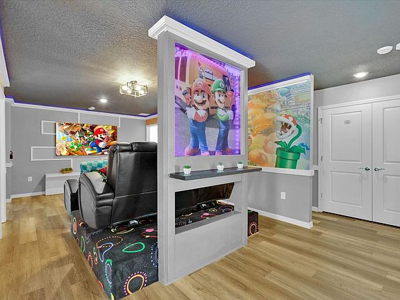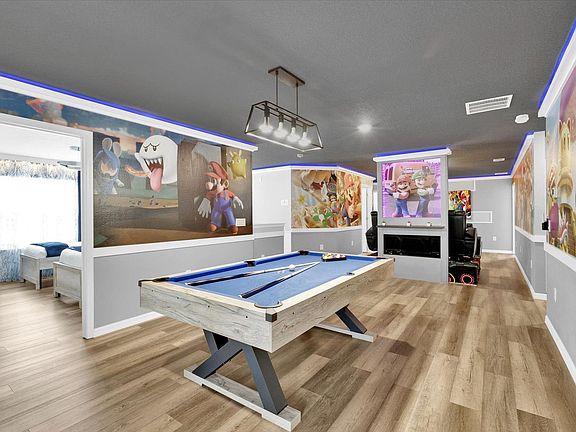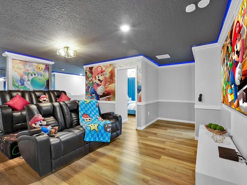 Welcome to this brand new luxury 10-bedroom vacation home located in the gated community of Windsor Island Resort, offering a private pool and spa with a stunning view of Disney fireworks. This spacious home is designed to accommodate up to 27 guests, featuring 8 bathrooms and a fully equipped kitchen with dining space for sixteen, plus additional seating at the kitchen island. Enjoy the themed rooms, including a large Star Wars room with bunk beds, a Princess-themed bedroom, and a Super Mario-themed movie room. Indulge in the luxurious amenities of this home, from the Italian furniture and five-star hotel mattresses to the BBQ kitchen by the pool area. The property boasts a 400 sq. ft. arcade and a 700 sq. ft. movie theater, perfect for entertainment. The fully equipped kitchen and dining area provide ample space for gatherings. Guests can enjoy the electric vehicle charger for $15.00 per day plus tax and the option to heat the pool and spa for an additional $30 per day plus tax. The BBQ is available for use at a charge of $200.00 plus tax, which includes two propane tanks. Situated near all of Disney's parks and attractions, this home offers easy access to the best of Orlando. The Windsor Island Resort provides a range of amenities, including a resort-style swimming pool, dual waterslides, a lazy river, and a fitness center. Nearby shopping and dining options are just a short drive away, with Walt Disney World only 9 miles from the property. This property is smoke-free and pet-free for your comfort. Access to the Windsor Island Resort requires all guests to be on the registration form, and identification is needed for those over 18. The resort allows a maximum of 5 cars, and parking rules are strictly enforced. Check-in is facilitated through an online email system, and 24/7 on-call maintenance is available. Complimentary Wi-Fi and on-site parking are provided.