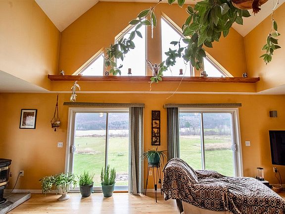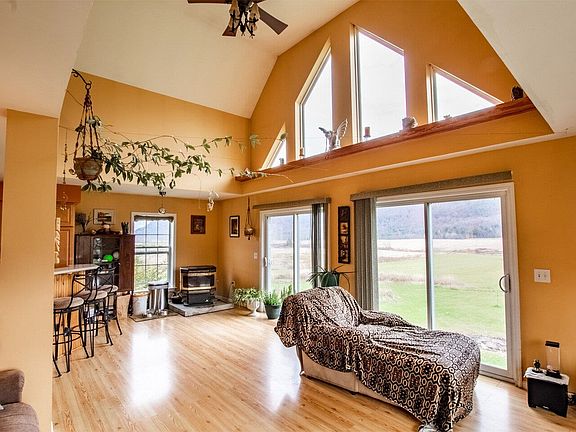 Welcome to this amazing property in Monkton! Enjoy the tranquility of 10 acres of beautiful valley views and sprawling pastures. Wake up to sunrises over the mountains and sip your coffee while sun pours through the two-story living room windows. This 2006 build faces Hogback Mountain with sweeping pastures and gorgeous fall sunsets. The lofted ceiling, abundance of natural light, and pellet stove make the living room a cozy spot in all seasons. Add on a deck and the indoor-outdoor experience of this home will be complete. The primary bath has a jacuzzi tub, dual vanity, stand-alone shower, and plenty of space. A second bedroom and full bath complete the main floor of the home. Upstairs you will find a loft area perfect for a home office or reading nook. The spacious second floor bedroom has a roughed in bathroom and closet. Increase the value of the home by finishing off the second floor with additional baseboard heat and a small section of carpet to complete the flooring. The basement offers over 1,100 sf of storage or bonus space with a walkout slider to the backyard. The sellers previously had 29 raised beds, bushes, and 9 apple trees for any gardening enthusiasts. Come see the best of the Vermont outdoors, views, and this comfortable home today!
