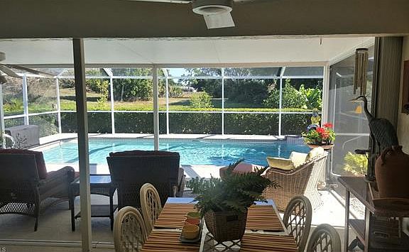 EXTREMELY WELL MAINTAINED POOL HOME - great location!!! Back on market with brand new roof!! Come take a look at this warm and inviting home - Just under 1,600 sf - 3 bedroom - 2 baths - large pool. You will love all of the natural light that brightens this home offers! Kitchen has newer countertops, newer stainless appliances, spacious pantry and a pass through window to the patio! This home is very well maintained and offers some of the original vintage charm!! Terrazzo flooring in the family room - along with crown molding and many windows create such an inviting space - warm wood laminate flooring in formal living/dining area as well as master bedroom. Both bathrooms have that vintage charm and are both in excellent condition!! The pool area has extended roofing for entertaining - large pool - manicured landscaping and additional concrete outside of the caged area - and plenty of privacy!! The A/C system is only a five years old! Location is perfect - just a few miles away from downtown Cape Coral and all of the social activity the area offers! Sidewalks and bike lanes are in place as well!! You won't be disappointed!!!!