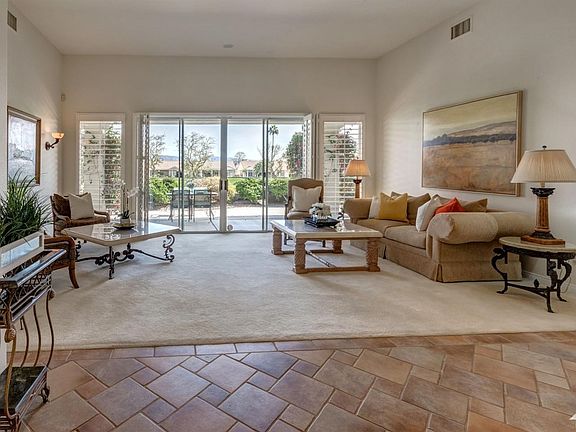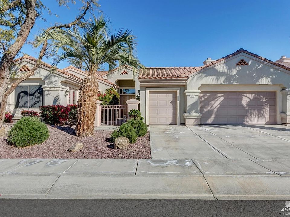 55+ Sun City Palm Desert. Monaco model elevated over the 13th hole of the Santa Rosa golf course with gorgeous views of the mountains. Nice curb appeal, gated courtyard. Bright and cheery, high ceilings, transom windows, plantation shutters. Large eat-in kitchen with chefs island, skylight, corian counters. Family room with custom fireplace. Living room/Dining room with wall of windows to the fabulous view! Master bedroom has bay window, bath has tile counter, double vanity, soaking tub, closet system. Extended guest suite with french doors to courtyard. 3rd bedroom/office has full bath with tub. Laundry room has sink, counter, and cabinets. Extended patio great for entertaining. Extended garage with storage cabinets.(2) New A/Cs in 2016.