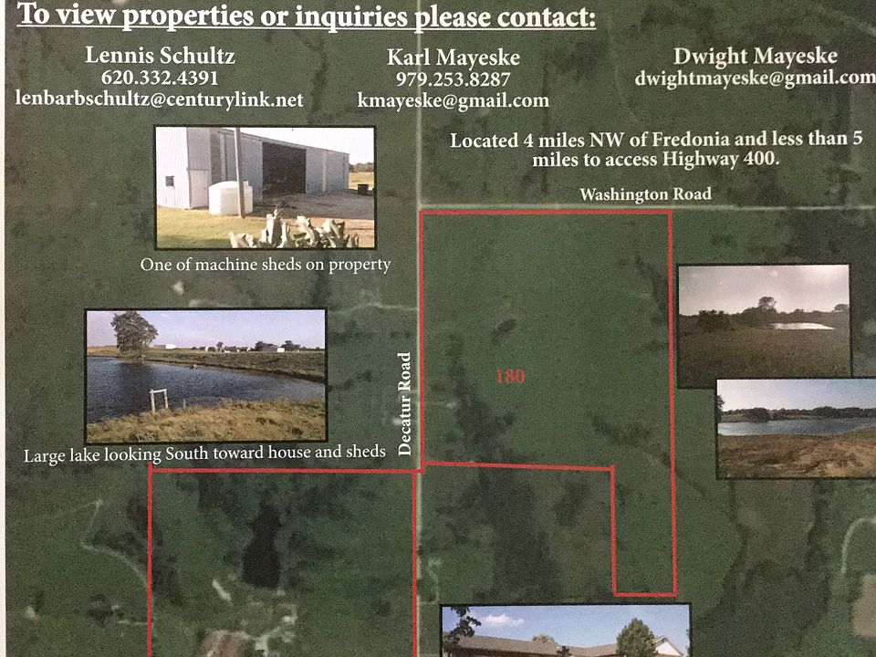 160 acres + 3008 sq ft 5 BR 2 1/2 bath home with attached double car garage,partial basement and an additional 352 sq ft is garage or storage building. 2 machine sheds 50x70 and 40x60. Property includes 50 acres tillable, balance in fenced pasture and partially wooded with wet weather creek running through it and an 8 acre stocked lake. Property is great for hunting. Also included is an additional 180 acre fenced pasture for sale with 3 small ponds and small stands of timber and a wet weather creek running through it. This can be split into 2 separate properties. This price is for both. The 160 with home is $3200 an acre and the 180 is $2200 an acre.