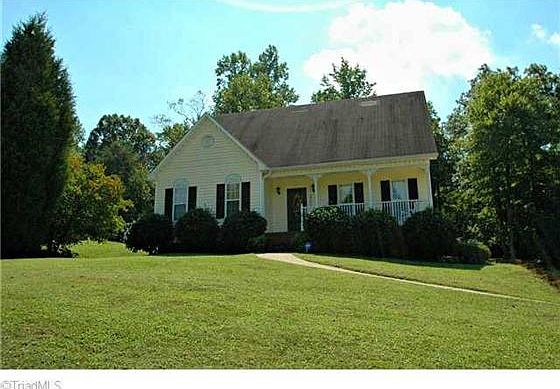Charming rocking chair front porch! Spacious living room features a cozy corner fireplace with gas logs. Sunny eat-in kitchen with tile floors. Sep formal dining room. Desirable main level master suite with garden tub, sep shower and walk-in closet. Full basement with den, full bath and a 2 car garage with plenty of storage. Deck overlooks a large back yard with mature trees. Close to shopping I-40 and Hwy 52.