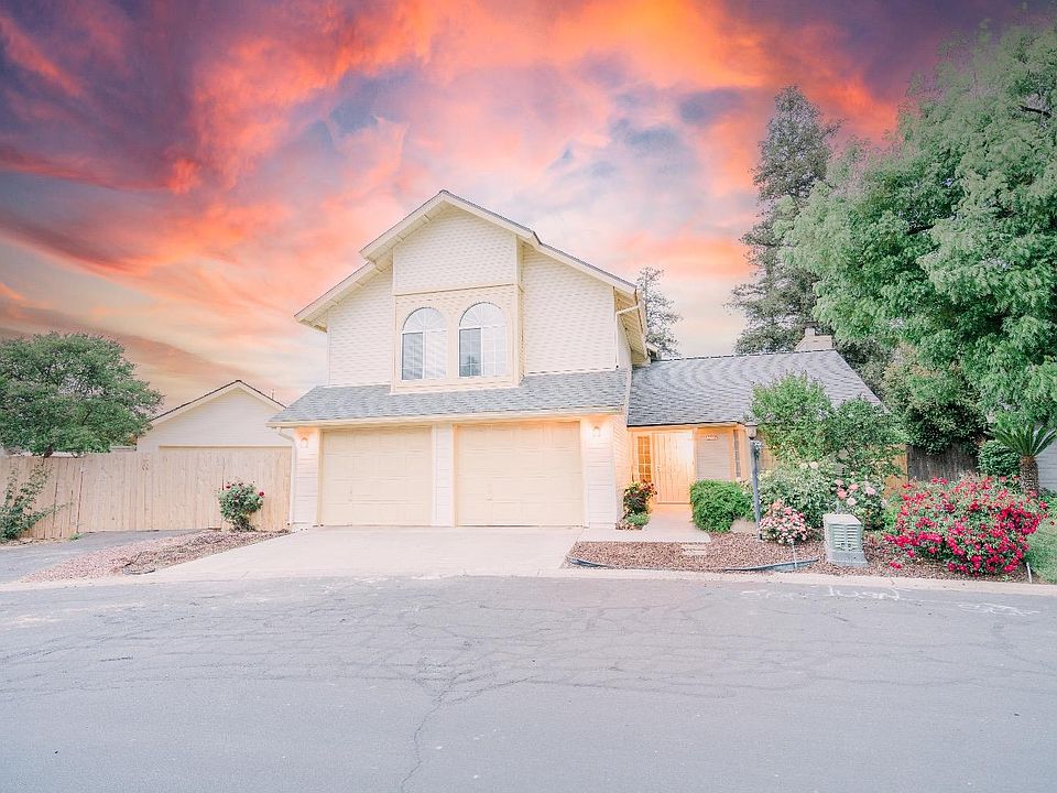 Charming NW Fresno home perfectly nestled on a large corner lot in a secure gated community with inexpensive HOA fee. Upon entering the home you are greeted by a great room with vaulted ceilings that flows into a cozy fireplace room with adjacent bedroom that has views of the lush back yard. Off the great room you enter a spacious working kitchen area ideal for family cooking events. A half bath with outdoor access completes the downstairs. Upstairs are two bedrooms and full bath plus a primary suite with an extra tandem room that opens onto the upstairs balcony overlooking the backyard oasis. The backyard features a sparkling pool and waterfall, two separate decks, patio area, fenced garden and garden sheds, multiple producing fruit trees and grape vines growing over the shaded pergola. NOT JUST THAT...But along with the attached 2 car garage, there's a separate 2 car garage/shop! Plenty of room for family gatherings, all near excellent schools, restaurants and shopping. Don't miss out, schedule your appointment today.