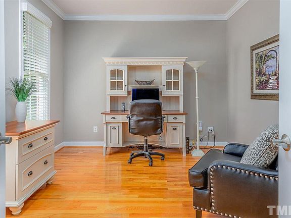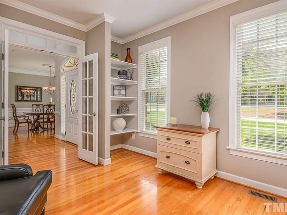 A rare combination of beauty, quality, and privacy! This custom home has a large, open-design kitchen w/lots of prep space, a 1st floor office & 1st flr guest suite. Coffered ceilings, lots of site-finished hardwood floors. Large screened porch & patio overlook a private back yard w/NO homes or roads behind you. Walk to the area's best schools, pool, Middle Creek Park, baseball complex, playground, soccerfield, disc golf, community center. Convenient to upcoming 540 but not too close to see it!