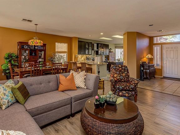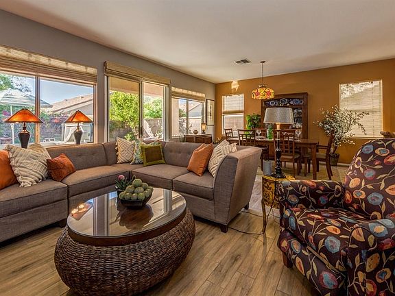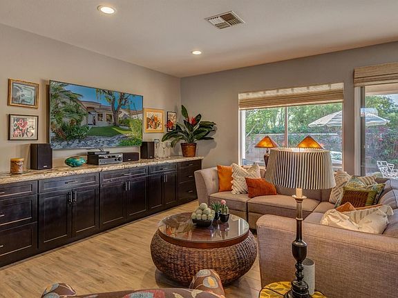 This 2 bedrooms plus den and hobby room, St. Croix model is beautifully remodeled with approx. 80,000 in upgrades. With tile floors throughout, new rich dark cabinets, exotic slab granite counters, stainless appliances, wine fridge, new custom window coverings, and an eco-spa on the patio, it's ready to move into. The landscaping is lush and easy to maintain. There is a peekaboo view of the mountains and a nice peaceful fountain in the backyard. The garage has overhead storage, metal shelving, A/C has a new compressor, and a nice Samsung washer and dryer set is included. Furnishings are negotiable outside of escrow.