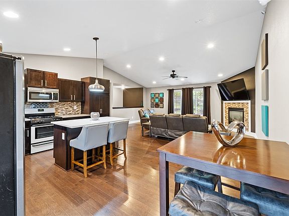 large sized bedroom. Going down the stairs you will see two finished bedrooms, another full bathroom/laundry room, and an attached two stall garage with a walkout door, leading you to a concrete pad in the huge backyard perfect for entertaining and relaxation. Call your favorite realtor, and schedule a showing today! All information obtained from Seller and public records.
