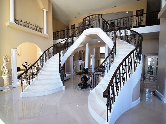 Stunning home with incredible features. 25 foot ceilings in several rooms, dramatic dual staircase and 13 foot iron front doors, marble floors throughout, chef's kitchen with 6-burner Wolf cooktop and Viking appliances, countertop and cabinet space galore, owner's retreat on main floor, large walk-in shower and jetted tub, 4 large BR's and a bonus room up, wonderful covered patio and detached second kitchen with commercial appliances makes for perfect entertaining. Private gated entrance.