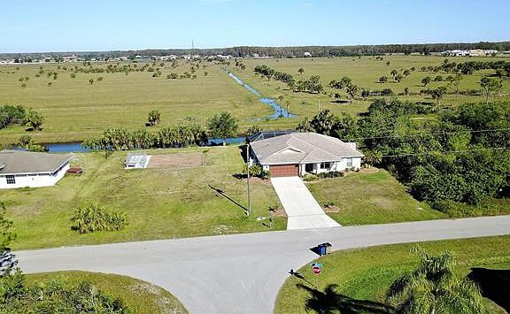 Double lot with nearly a half acre off Cemetary Rd in Buckingham. 2005 built, 3 bedrooms plus a den, 2 1/2 bath pool home in excellent condition overlooking water and expansive views. Covered front porch leads to a well laid out greatroom floorplan with vaulted ceilings and a large under-truss lanai. Light tile floors run through the open kitchen and baths, wood-look heavy traffic flooring in the bedrooms, den and closets. A true laundry room with storage and counter space leads into the house from the garage. Stainless French door refrigerator, stove, and microwave and solid surface counters in the kitchen. The den has 8 lite glass French doors, two toned paint, decorative chair rail trim, and is attached to the pool bath so it can function as a guest suite. The 2nd and 3rd bedrooms also have decorative trims, share a bath and a linen closet. The master suite has separate tub and shower, generous closet space and dual sink solid surface counters. Large pool area is surrounded by lawn and has a substantial area of protective fencing. Poured concrete slab has kennels with running water, large flat mulched area for boats, RV's, or work vehicles. Too good to pass up