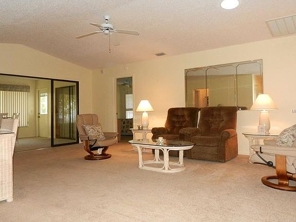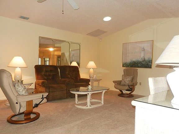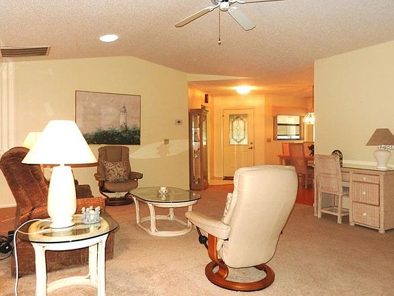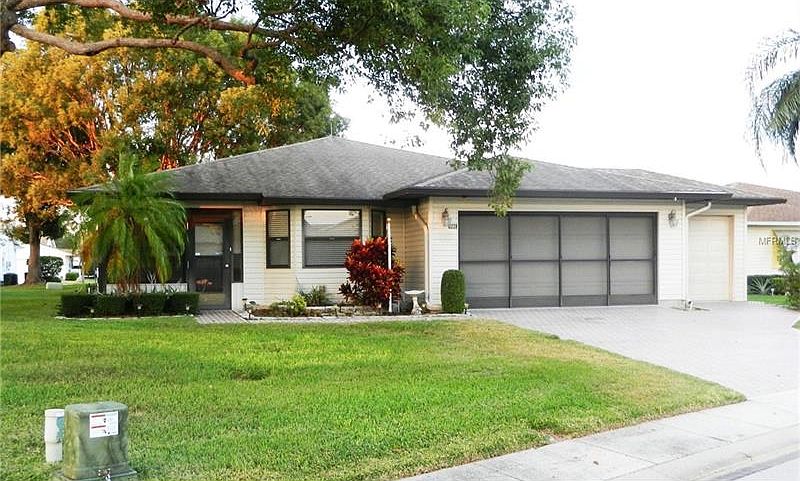 What a wonderful home!! Situated on a lovely oversized lot with trees, this home is nearly 1800 sf! This is a 2bed/2bath split plan that is 2 master suites. The master bath is large with a garden tub & separate shower,dual sinks & walk-in closets. The master bedroom features custom Plantation shutters. The secondary bed/bath can be shut off from the main areas by a pocket door. Guest bath is large and features a skylight & new commode. The 2nd bedroom features a large walk-in closet. Huge Great Room with vaulted ceilings will accommodate the largest of furniture! There is a den on the rear of the home with large windows overlooking the backyard. At the front of the home, there is a glass window enclosed Sun Room measuring 19 x 9 with Berber carpet. Other amenities include a 2 car garage + a golf cart garage, wood laminate in dining room, tiled kitchen & inside laundry (incl.washer & dryer), newer interior paint throughout & decorative finish on driveway & walk. A/C system & duct work were replaced in 2006, HWH repl. 2008. Refrigerator does not work. 01/10/17