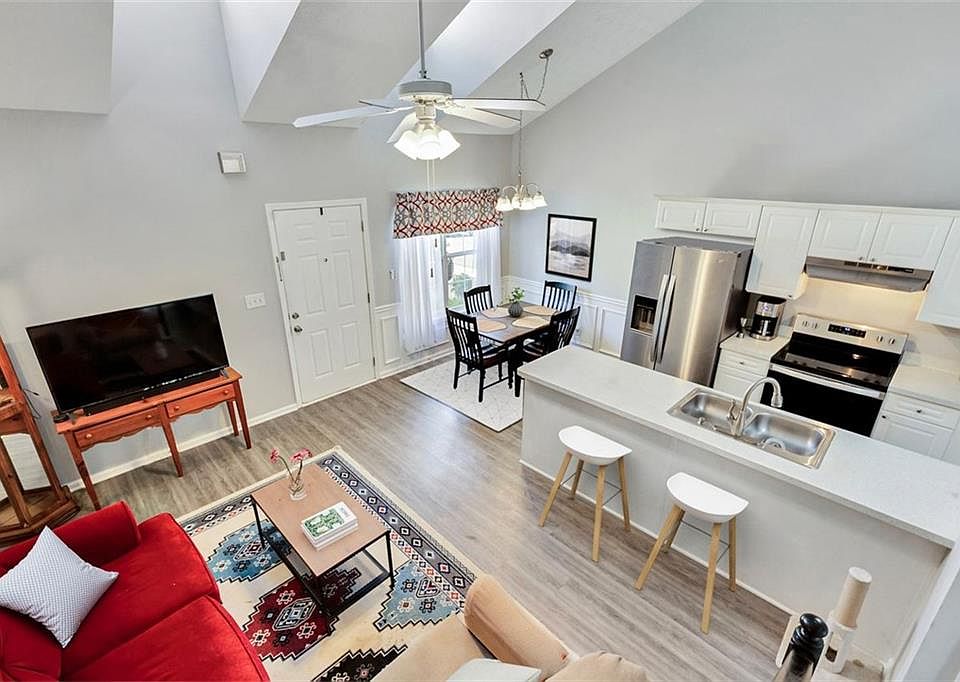 Indulge in the pinnacle of refined living with this impeccably enhanced 2-bedroom, 2-bathroom townhome, where timeless design, elevated finishes, and a premier location converge to create an exceptional lifestyle. Privately tucked away in a serene enclave, this sophisticated residence offers effortless access to all that North Georgia has to offer—just minutes from major highways, mere moments from everyday conveniences, and only 5 miles from the shimmering waters of Lake Lanier. Step inside through a level front walkway into a luminous open-concept layout, where soaring ceilings and skylights flood the living room with natural light, creating a warm and inviting ambiance. Luxury vinyl flooring installed in 2021 flows seamlessly throughout the main living areas, adding an elegant foundation to the thoughtful design. The bright, airy kitchen features updated stainless steel appliances (2022), abundant cabinetry, and a cozy breakfast nook—perfect for morning coffee or hosting with style. Both bedrooms function as private suites, each offering walk-in closets and spa-inspired en-suite bathrooms. The main-level suite is a true sanctuary, complete with a dual vanity and private access to the tranquil, fenced-in patio—an ideal setting for alfresco dining, quiet relaxation, or elegant entertaining. Custom window treatments, including premium room-darkening blinds in both bedrooms, further elevate the home’s tailored interior. This residence is also thoughtfully updated for long-term peace of mind, including a new roof (2020), new heat pump and air handler (2022), water heater (2022), and a newly installed high-efficiency 2-ton AC system (2025). Outside, newly refreshed, low-maintenance landscaping offers stunning curb appeal and year-round beauty. Additional features include a 2-car private driveway, a covered carport with an integrated storage room, and access to a wealth of community amenities. Residents enjoy a low HOA fee with access to a swimming pool, tennis court, and playground—providing resort-style comforts just steps from your front door. This exceptional townhome is the epitome of low-maintenance luxury living—where elegance, ease, and location unite in perfect harmony.