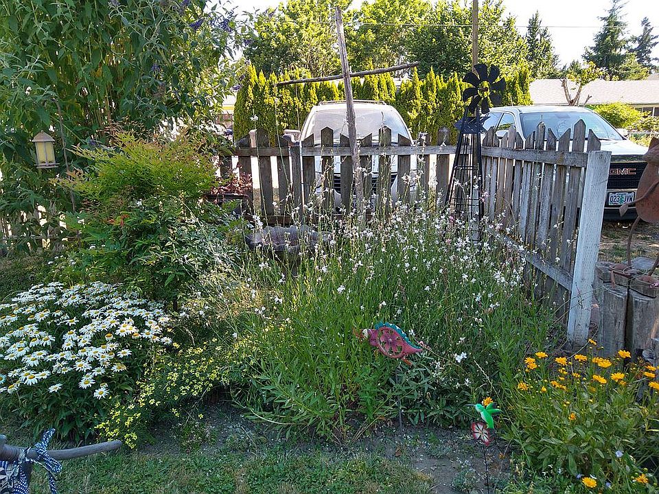 garage was converted into big family room with sliders which were leaking and are being replaced, garage conversion has knotty pine wood paneling and linoleum flooring; also has laundry/mudroom...access right off kitchen/dining area. Master br has big window looking onto garden area with roses underneath, smells HEAVENLY in spring/summer, is large with big double-door closet; 2nd bedroom has own full bath and outside entry from deck, could be mother-in-law suite and has standard closet. 3rd br is small, holds twin bed-tallboy dresser-2 side tables and has small standard closet...hallway has 2 good sized closets w shelving...fair sized back yard, large deck is being torn down and rebuilt. Front yard: landscaping and new picket fence in front yard, great neighbors, safe quiet area. kitchen is small but easy for more than two people to walk around in, not much counter space but has eat-in dining area big enough to hold table seating six, has sliders to deck (goes length of rear of house), backyard has shed, privacy fence at rear of yard; living room is cozy with big window, gets daytime sun, loads of mature shade trees keep home much cooler in hot weather (don't need that A/C as much!); both baths have sink, toilet, tub/shower, main bath small but has full-sized tub/shower; house being remodeled, old carpet being torn out and either replaced or new laminate flooring to be installed. Newer furnace, well water, new disposal in 08, new bath fan/light/vent in 08, new wiring to outlets in many rooms in 09, plenty of off-street parking in double-sized drive, plus parking on street side of front fence for up to five cars.