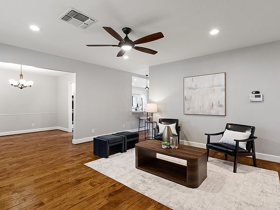 Nestled deep among the trees on a .3-acre cul-de-sac lot sits this meticulously maintained and updated transitional home in highly desirable Glen Meadow Estates. This 4-bedroom, 2-bath home offers 2,232 square feet of thoughtfully designed living space with an open layout great for easy living and entertaining and IS PRICED BELOW APPRAISED VALUE! The open-concept kitchen with extended peninsula allows for counter seating and also features quartz countertops, Shaker-style cabinets & soft-close drawers. Stainless appliances include convection Frigidaire Gallery double ovens, LG microwave, KitchenAid dishwasher, & 5-burner Whirlpool gas cooktop. Main living spaces, including the dining room, feature handscraped wood floors. Formal dining room is situated perfectly between the formal living space and kitchen. Main living space is open to kitchen with a captivating stone wall that includes a gas log fireplace as well as great views of the backyard. Large primary bedroom features a walk-in closet and ensuite bath w-dark Shaker-style vanity, quartz countertop, and frameless glass shower with multiple shower heads and body sprays. Additional bedrooms are well-sized with access to a hall bath and just re-carpeted late last year. Extra-large storage closet as well as a thoughtfully designed utility space are both accessible in the hall. The backyard is spacious with lush landscaping including Peach trees, an Oklahoma Redbud, a Chinese Pistache Tree, and more native greenery and plants. There is plenty of room to add a pool or an additional structure-guest house. Ideally located with easy access to the tollway and I-635, this home combines timeless ranch charm with modern updates in a prime location conveniently close to Dallas’ top private and collegiate prep schools, major highways, shopping, and dining.