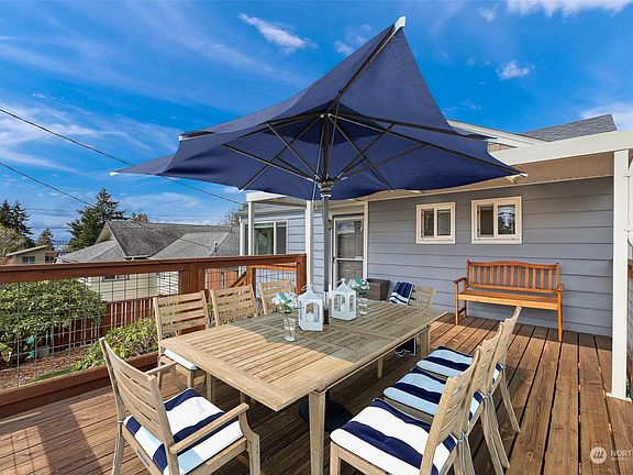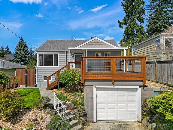 Gatewood classic beauty! 3 blocks from bustling California Ave with shops, eateries, coffee, farmer's market. Close to parks, including Walt Hundley play fields, tennis & pickleball. Home sits above street level. Two beds & full bath on main floor. Non-conforming 3rd bedroom, 2nd bathroom & garage access on lower level. Updated electrical, windows, furnace & siding. Refreshed baths & kitchen. Hardwood floors; lots of windows for light & bright ambiance. Fully fenced, level backyard with 3 decks & patio area for entertaining on beautiful summer nights; partial Puget Sound & Olympics views. Two car, tandem garage for parking or storing "toys" (bikes, boards, SUPs, skates and more!) to take advantage of West Seattle parks, beaches & trails!