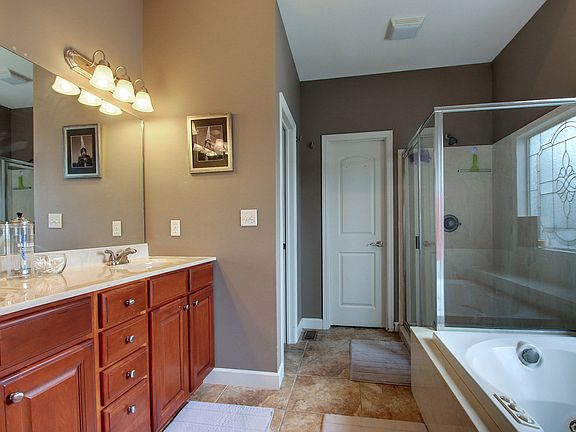Sitting on a large corner lot this home is one of a kind. Recently redesigned, master bath includes a jaw dropping state of the art zero entry shower with waterproof substrate system preventing water leaks and thereby providing peace of mind for years to come. New carpet and paint throughout means everything's done and ready for you to simply move right in. The home's 18' ceiling towers over the foyer and living room, granite counter tops in the kitchen, stainless steel appliances, and Brazilian cherry cabinetry are a few more of the amazing features this home has to offer. Don't forget the breakfast nook that allows for an abundant amount of natural Southern light. Basement has multiple egress windows and rough in for bath making it hyper functional when it is finished.