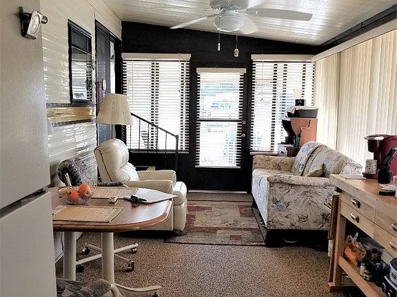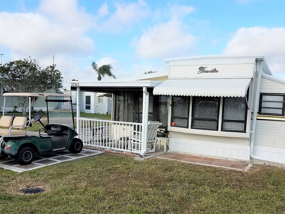 Located on leased land in 55+ community. 1 Bed, 1 Bath fully furnished, Florida Room with glass windows, screens, Chatahoochee floor, wall A/C and heat unit, and separate large storage room in back. Main home is cozy and roomy with plenty of storage and sleep sofas, kitchen has a gas stove and built-in microwave. Bedroom has large closets, built-ins, and a queen size bed, and the bathroom has an easy step-in shower. Extras with this home are AMS Roof-over, additional exterior shed, 2015 central A/C system, and a cute covered front patio! AND THE GOLF CART IS INCLUDED!