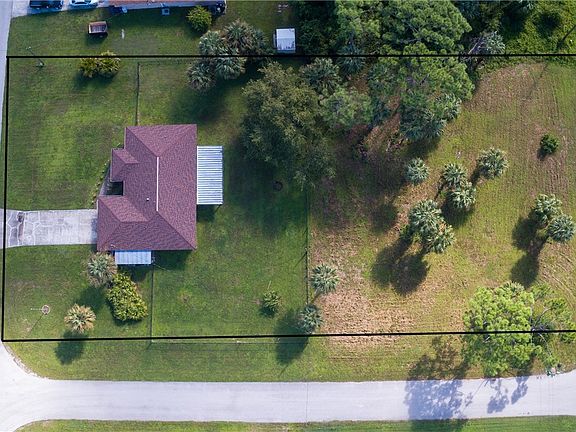 This is the expansive Country Retreat you've been looking for! This modern, ranch-style home is situated on a rarely available, oversized .72-Acre Double Corner Lot! This inviting 3-bedroom, 2-bathroom home offers the perfect blend of peaceful rural living with modern comforts. With about 1,300 square feet of well-maintained living space, this home is perfect for those seeking a private retreat or a family ready to embrace the charm of country life. Featuring easy to maintain laminate and tile flooring throughout, beautiful kitchen with granite counter tops, white Shaker cabinets, stainless steel appliances, and island counter with plenty of space to cook and enjoy a meal. The open floorplan features volume ceilings and plenty of natural light from your large windows and sliders to your massive backyard. The primary suite features a chic sliding barn door to your ensuite bathroom. Two additional bedrooms feature a shared bathroom with Shower/Tub combo. Enjoy your fully fenced in backyard with open lanai and firepit for cozy evenings by the fire or entertaining guests! No HOA and Not in a flood zone!! Enjoy homeownership at it's fullest. Whether you envision a pool, barn, workshop, guest house, etc. the large .72-Acre lot provides endless possibilities! Take advantage of this highly sought-after opportunity, make an offer TODAY!