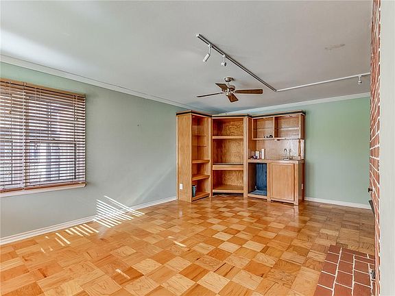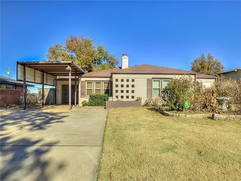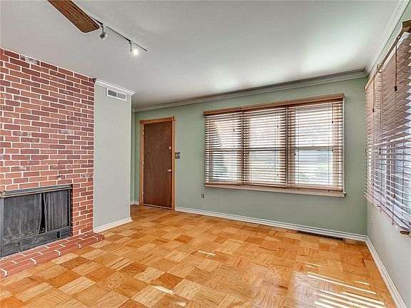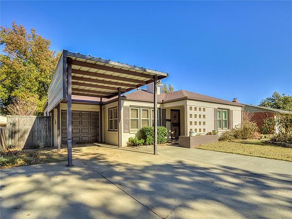 Good floorplan with unique details nestled in. Cute three bed, one bath home close to tons of OKC amenities! Duck under the protection of the covered porch while you fumble with keys and bags; plenty of room to leave muddy shoes and wet umbrellas here before heading inside. Check out his unique floor! You will never seen anything like it anywhere else. Beautiful wood floor to accent the nifty corner fireplace that is sure to give warmth to the whole L shaped living/dining space. Super cozy while you prepare something tasty at the wet bar area. Galley style kitchen with dining nook overlook the yard with mature trees. Each bedroom features a large closet and a ceiling fan. Cool wood floor in these areas too. Come check it out. You'll be glad you did!