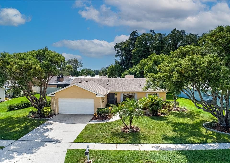 HOME SWEET HOME! Built by Rutenberg on PREMIUM 0.23 Acre Conservation Lot, located in the highly desirable community of Fairway Springs. Split Floor Plan with 3 Bedrooms / 2 Bathrooms / 2 Car Garage. Spacious Living Room with Cathedral Ceilings and brick wood burning Fireplace. Kitchen has a breakfast bar and separate large Eat-In Kitchen area overlooking the private backyard. "HUGE" Covered Screened Patio. Just imagine entertaining family and friends on your Backyard Oasis. Master Suite has a Walk-In Closet. En Suite Bathroom has been UPDATED, new vanity with dual sinks, built-in cabinets, and walk-in shower. 2nd Bathroom has been UPDATED, new vanity with tub/shower combo. 3rd Bedroom has built-in closets, could be Home Office or Flex Space. Inside Utility/Laundry Room includes washer & dryer. Additional Storage Closets in Hallway. Oversized 2 Car Garage with storage and workbench. New Roof (2019) ~ New Interior Paint (2023) Low HOA only $350.00 annual/year. No CDD! LOCATION, LOCATION, LOCATION! Easy access to SR 54, Suncoast Expressway, I-75/275, Tampa airport, downtown Tampa, & US Hwy 19. Nearby beaches, golf courses, medical facilities, schools, shopping, restaurants, YMCA and much more! Zoned for TOP RATED schools in Pasco County. *Schedule your Private Tour Today!