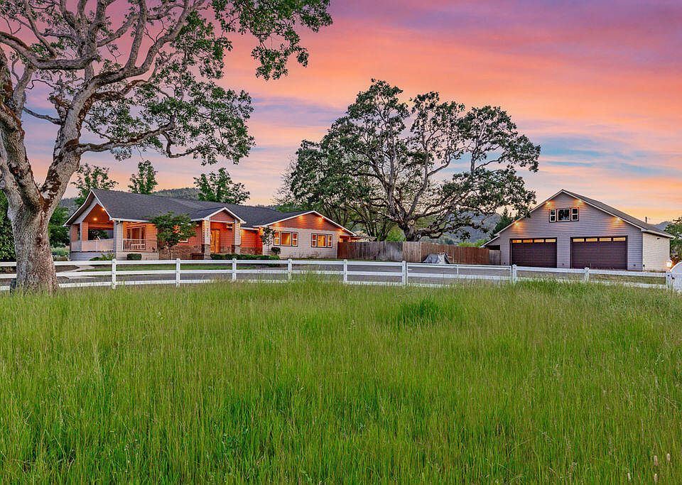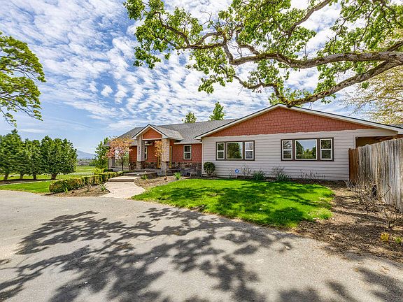 Beautifully maintained Live/Work/Income property! 11.10 Acres with updated, 2,985 sq ft single-story home with incredible views and fully functional 1220 sq. ft detached Office/Studio Apartment with Central Air for rent or personal use. Home has a wraparound covered deck, high vaulted ceilings, custom built ins, wet bar, beautiful kitchen w/ dbl ovens, gas cook top, walk-in pantry & island, all with granite countertops. Beautiful Master Bedroom and Bath. Additional ''Out'' buildings include: 8 Car garage with loft. 16x45 RV Garage for Class A w/hook ups & 50 Amps, 45x40 Barn/Shop & 30x70 Equipment Barn. Property has paved driveway and electric gated entry & irrigation rights. Has expansive views of the Valley & mountains in the West Hills. Has acreage for growing Hay or whatever you choose! Land could be leased for cattle, horses or vineyards. This home can become completely self sufficient with just a whole house generator or solar panels. Must see to appreciate!