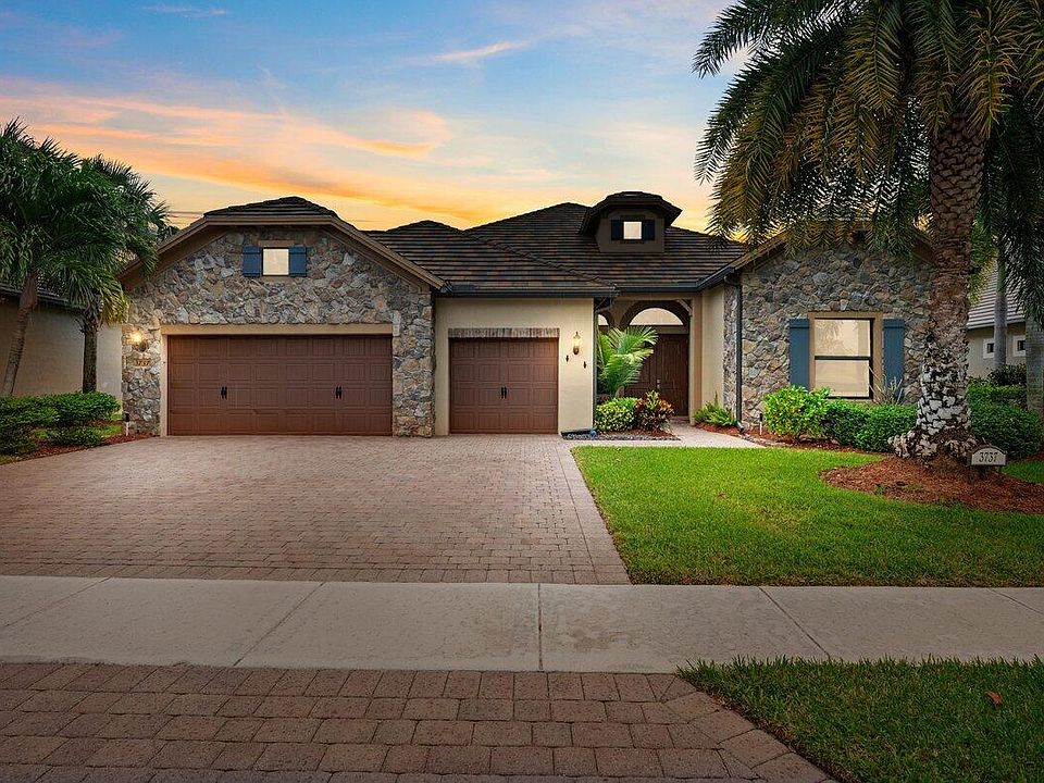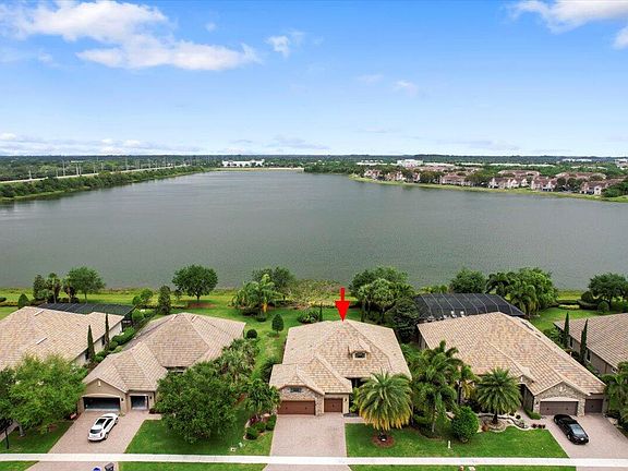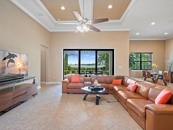 Looking for lakefront? Spectacular lake views compliment this popular Dartmouth model with open concept plan of living room, kitchen & dining area. Requiring a home office or den? This den has a double door entry for privacy and off the main entry hall for convenience if client appointments are necessary in your business. Steps into the home, your eye is drawn up to the stunning volume and coffered ceiling in the living room and the triple sliding doors inviting you to view Lake Lizbet. The kitchen is to the right with a large granite island, walk in pantry and Kitchen Aid appliances at your fingertips. All bedrooms have wood flooring with main living areas sporting 20'' diagonal tile. Owner's suite includes a large walk in closet, double vanity with sinks, separate tub & shower. The lanai has covered and open areas for sun protection or sun bathing, whatever your preference may be. The community amenities are boast worthy with a lovely clubhouse for social events, tennis courts, pickleball courts, fitness center and heated pool. The neighborhood is gated and manned for secure living and offers a back gate for residents that offers convenience for nearby restaurants & shopping. This is a pet lover's community, quiet & peaceful. You are going to love it!