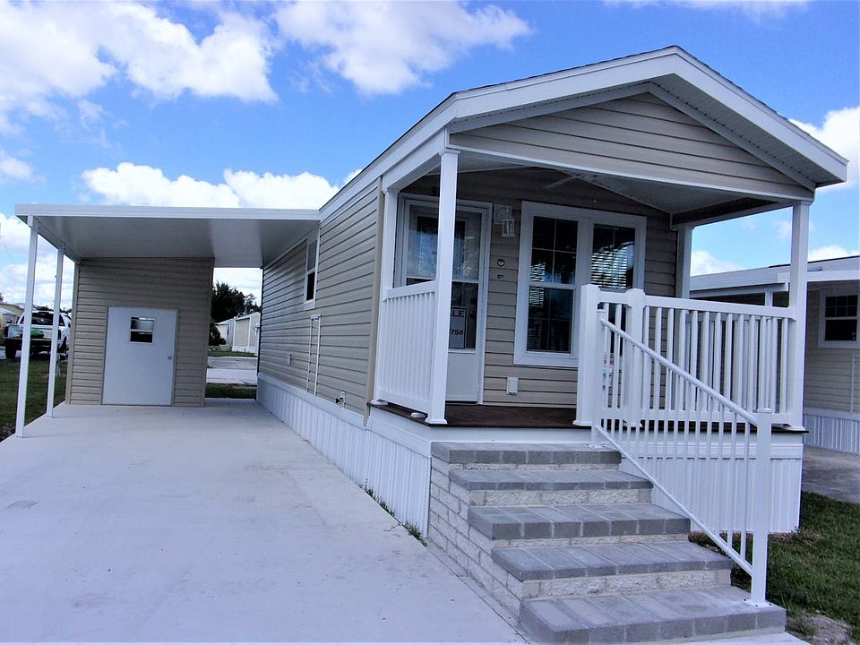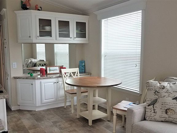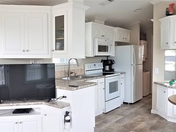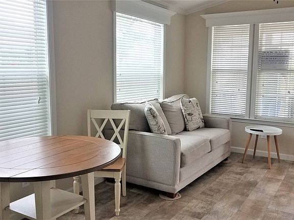 Located on leased land in 55+ community. 1 Bed, 1 Bath Park Model home - like new condition! Beautiful flooring throughout with TONS of cabinets and built-in storage, sleep sofa in living room, Whirlpool appliances, range with built-in microwave, refrigerator with ice-maker, large stack washer/dryer, gorgeous kitchen, and thermopane windows all around. Large bathroom has convenient step-in shower and roomy bedroom has double closets and a queen size bed, but could even have room for a kingsize. Terrific extras are central A/C, ceiling fans, a large attached carport, outdoor shed, cute front porch, and beautiful view of our smaller lake. CAN BE PURCHASED FURNISHED OR UNFURNISHED - NEGOTIABLE! COME CHECK OUT THIS PERFECT "SNOWBIRD GETAWAY" TODAY!